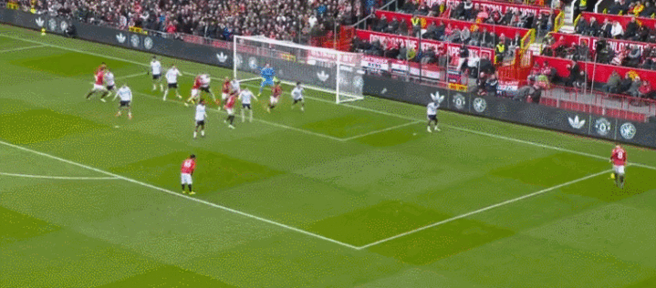 比赛刚刚开始不久,曼联就创造出机会。阿马德在右侧内切兜射远角,被扑了出去。第13分钟,曼联差一点丢球,幸好门将反应极快,在门线伸手挡出了必进球。5分钟后,库尼亚被放倒,裁判判罚点球,但随后改判为任意球。布鲁诺-费尔南德斯主罚,他把球罚进禁区,卡塞米罗抢点头球攻门,球进了!曼联取得领先。